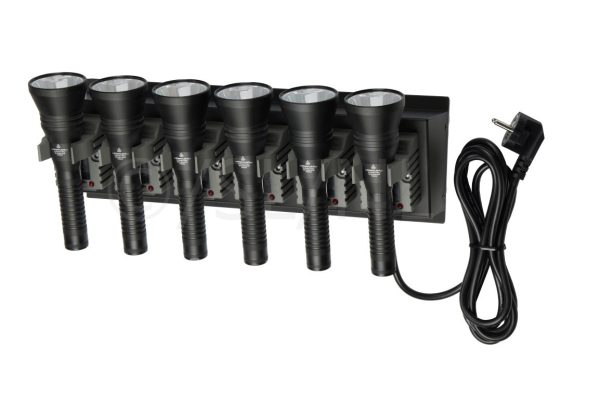 Een laadstation compleet met zes aluminium Strion LED HPL zaklampen en een laadstation 230 volt van Streamlight. Altijd snel en veilig jouw zaklampen opladen doe je met dit laadstation.